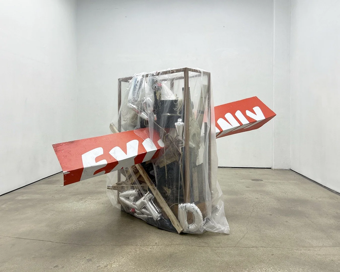 Bargain, 2024Trophy case, Glass, Exit Only Sign, Wood, Rope, clothing, wigs, Acrylic Paint, Cellophane4.5’x 9’x 6’