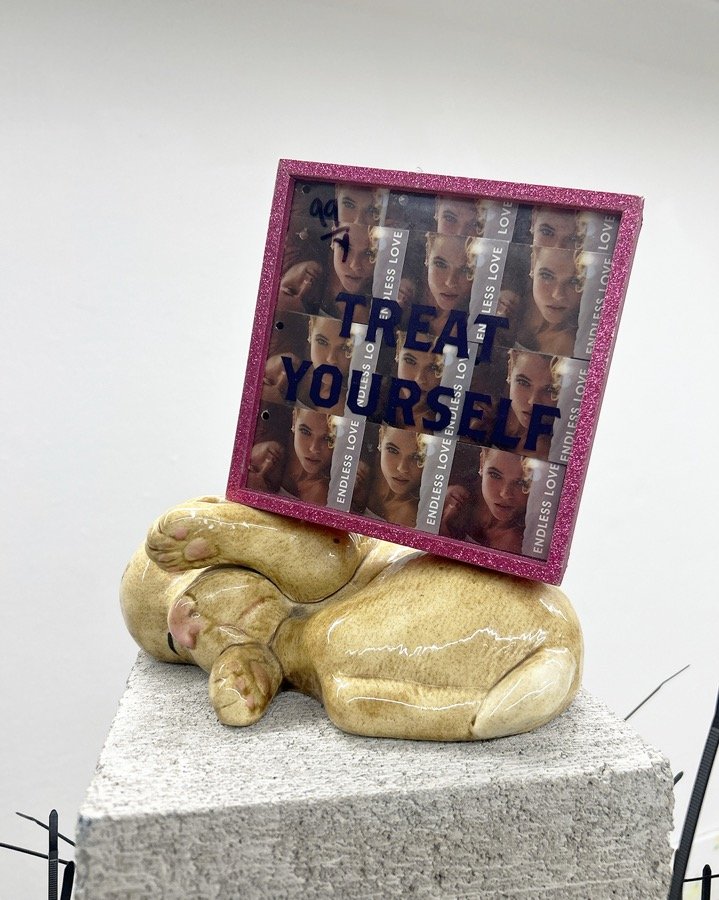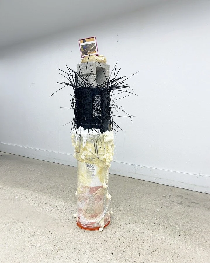 Buckets, Zip Ties, Frame, Paper, Foam, Cellophane, Concrete Brick, Ceramic Puppy